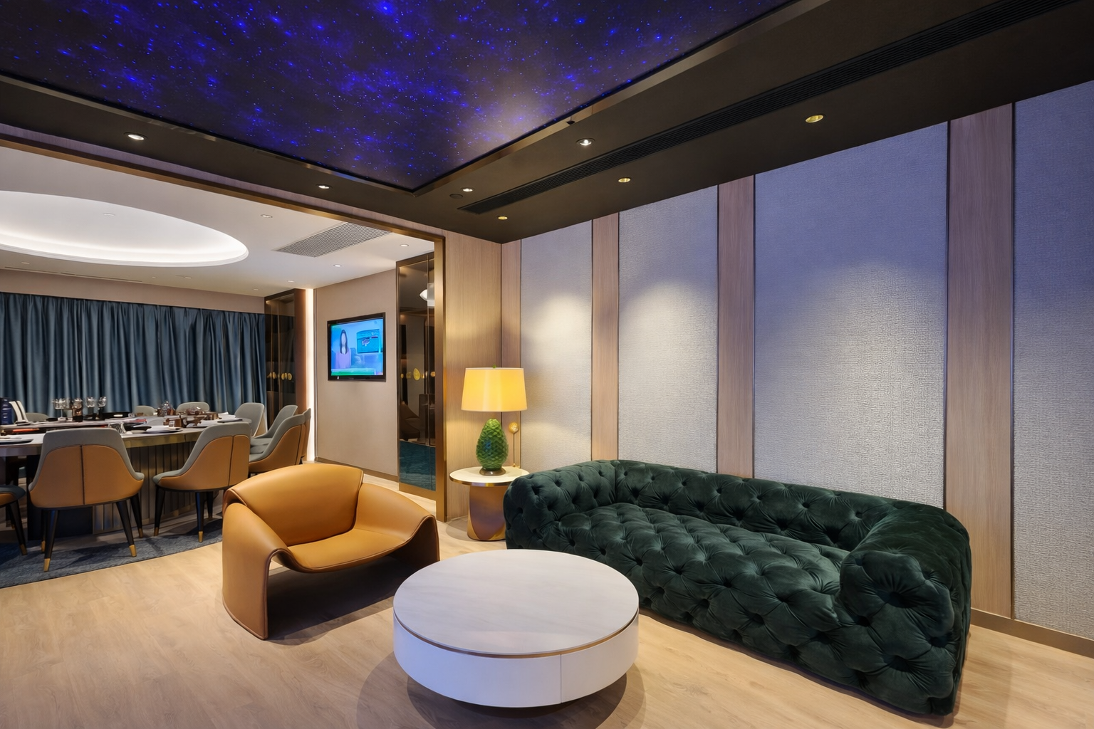 The design centres around privacy, comfort and understated luxury. Soft leather seating, warm wood finishes and brushed metal details introduce a modern sensibility, balanced with subtle references to traditional Chinese aesthetics.